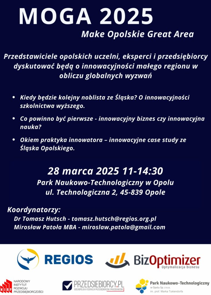 Moderacja: Tomasz Hutsch Panel nauki i biznesu: 12:15-13:00 – Co powinno być pierwsze – innowacyjny biznes, czy innowacyjna nauka? Moderacja: Paulina Wiatrowska Panel innowatorów: 13:15-14:00 – Okiem praktyka innowatora – innowacyjne case study ze Śląska Opolskiego. Moderacja: Mirosław Patoła Networking i dyskusja: 14-14:30